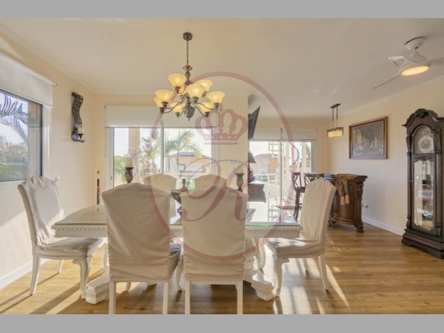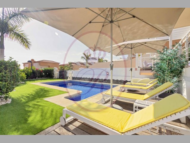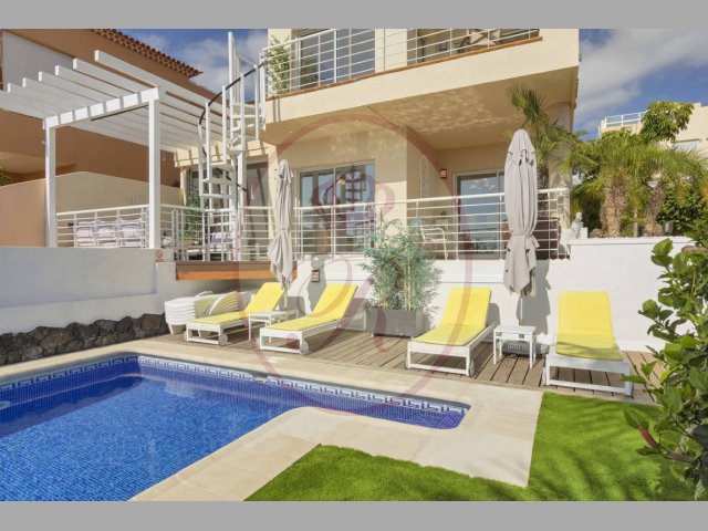 Step inside to find a spacious open-plan living area with large windows that flood the space with natural light and offer views of the pool and private garden. The fully equipped kitchen features sleek cabinetry, premium appliances, and ample counter space for home cooking. Each of the three bedrooms offers double beds, generous storage, and serene decor. The master bedroom has an en-suite bathroom and direct access to the corner terrace with views of the sea and La Gomera. The fourth bedroom, located in the converted basement is currently used as an office.